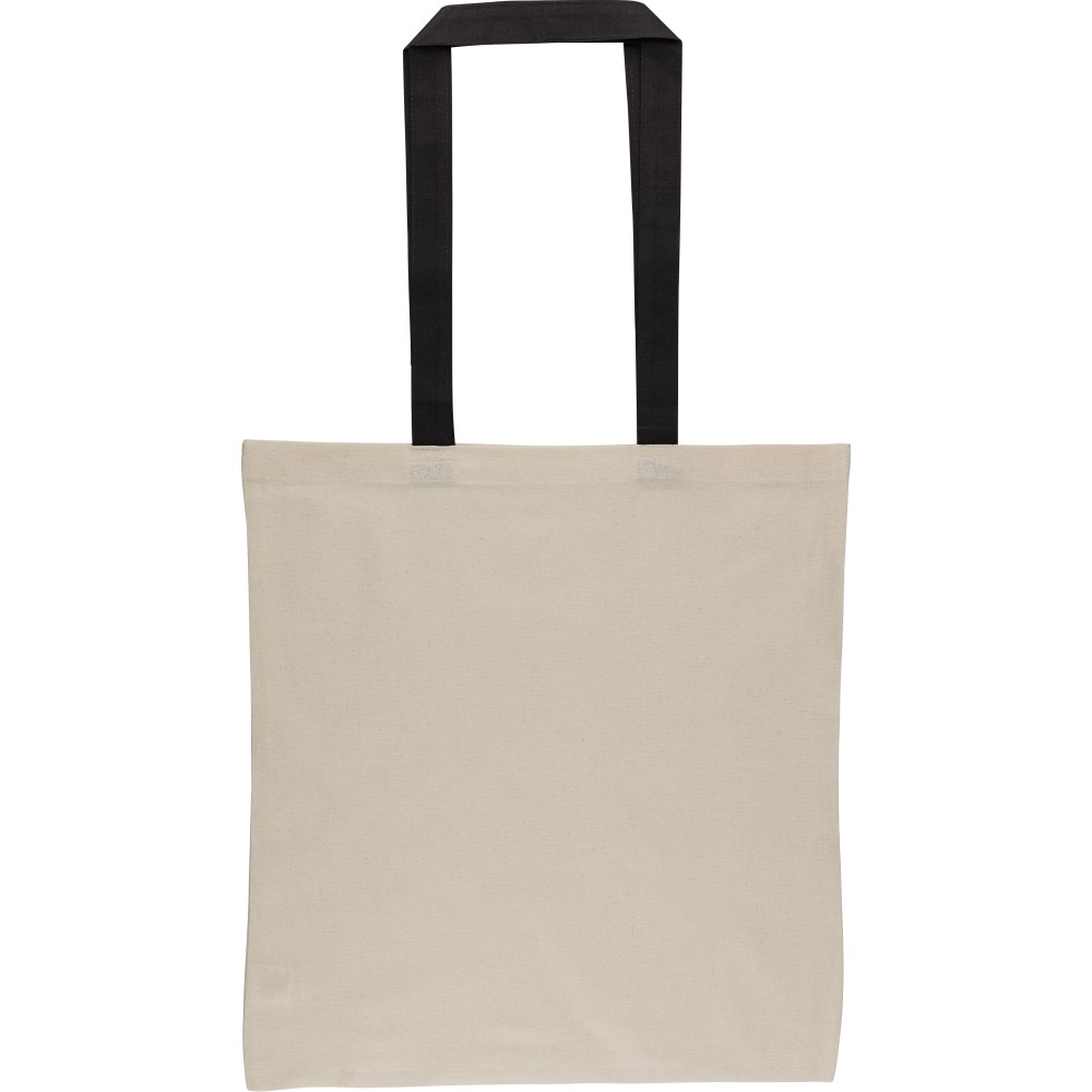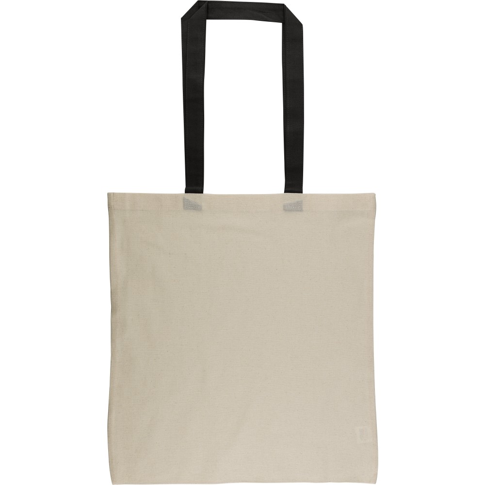 Oeko-Tex® cotton (140 gsm) shopping bag in natural color with colored handles. Size 38 × 42 cm with 70 cm long handles (2.5 cm width). Includes Oeko-Tex® label.