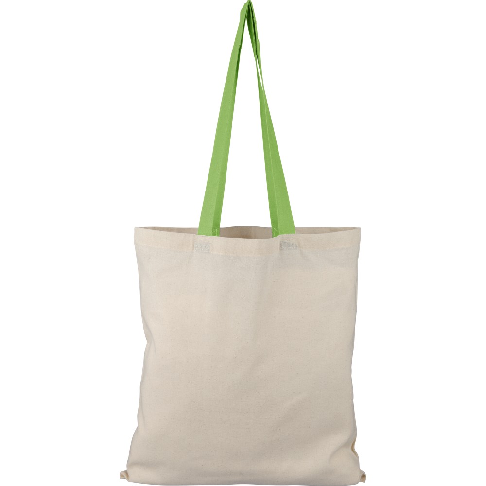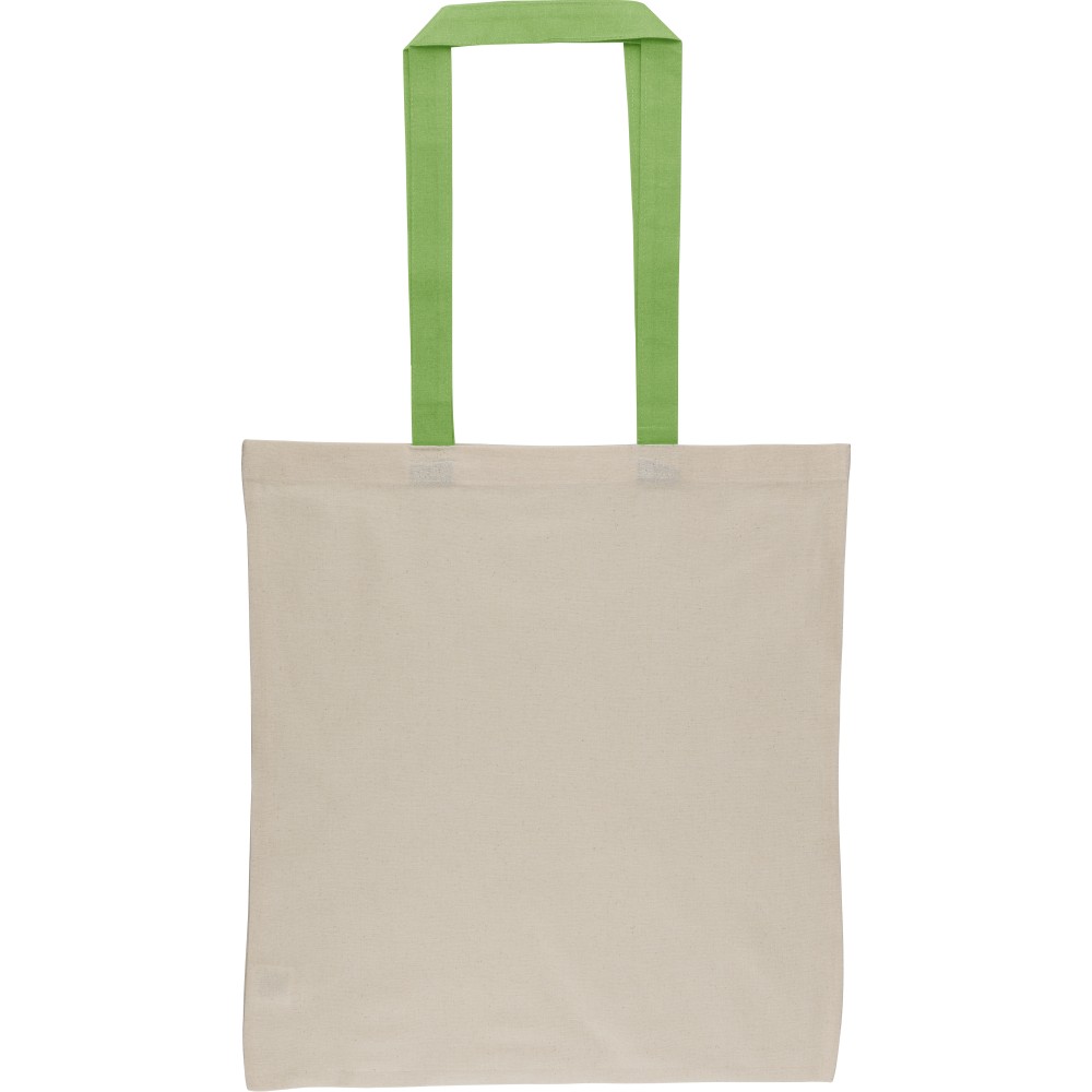 Oeko-Tex® cotton (140 gsm) shopping bag in natural color with colored handles. Size 38 × 42 cm with 70 cm long handles (2.5 cm width). Includes Oeko-Tex® label.