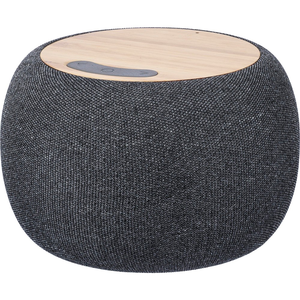 Bamboo and recycled ABS speaker with fabric details around the speaker. 5W output, DC 5V input, 1200mAh built-in rechargeable battery, with 6 hours of playing time. Working distance of 15-20 meters, signal-to-noise ratio of 87 dB. Frequency range: 100 Hz to 20 kHz. Includes 50 cm Type-C charging cable. Wireless connection technology: 5.2. Individually packaged in a brown cardboard box.