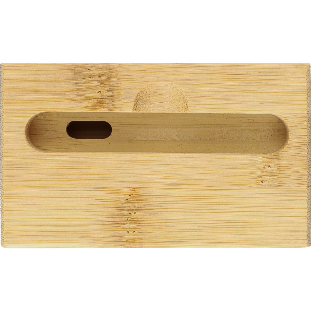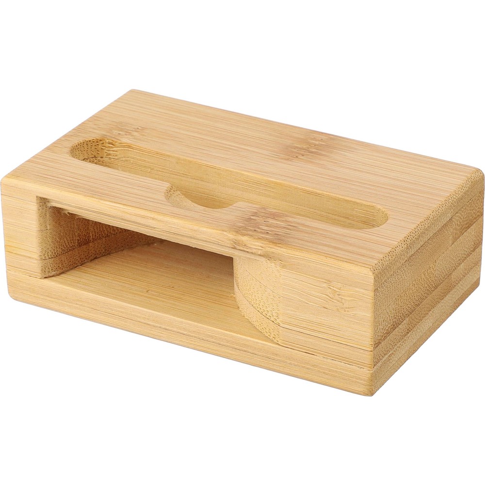 Bamboo phone stand with sound amplifier function. When playing music, the sound is amplified through the bottom without the need for power or batteries. Phone slot dimensions: approx. 8.2 x 1.2 cm. Individually packaged in a brown cardboard box.
