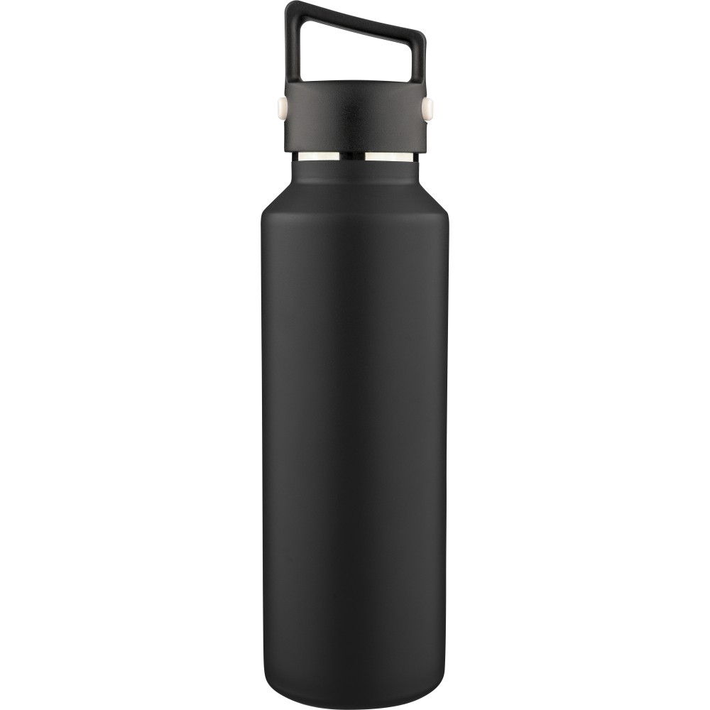 Recycled stainless steel vacuum bottle (600 ml) with double-wall construction, PP lid with carry loop, dual push-button lid opening, and laser-engraved recycled logo. Packed in a brown cardboard box.