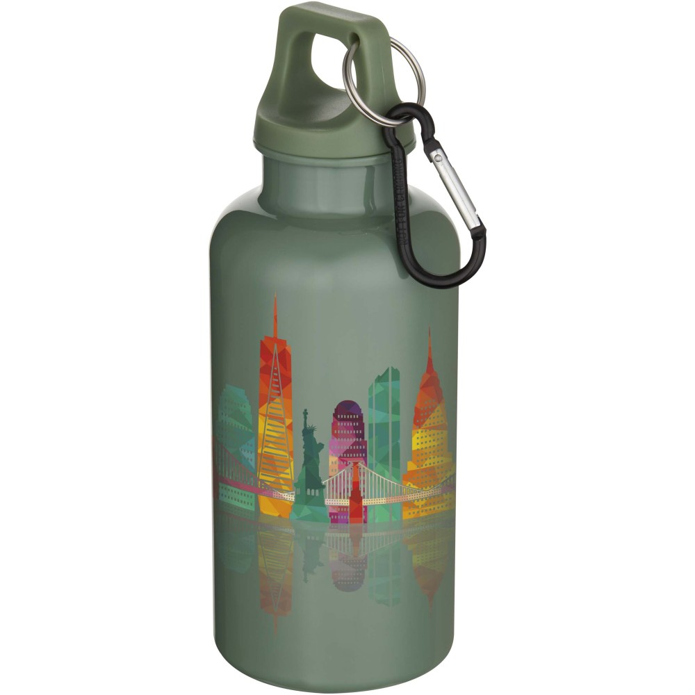 Staying hydrated at all times is possible with this durable yet lightweight 400 ml water bottle made from RCS certified recycled PET. It is the perfect companion while exercising, on day trips or at the office. The single-walled Oregon bottle has a twist-on lid and offers plenty of space to add any kind of logo. Clip the attached carabiner (not suitable for climbing) securely to a bag to avoid losing it. Manufactured in compliance with the EFSA approved PET recycling process.