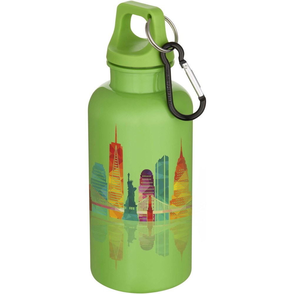 Staying hydrated at all times is possible with this durable yet lightweight 400 ml water bottle made from RCS certified recycled PET. It is the perfect companion while exercising, on day trips or at the office. The single-walled Oregon bottle has a twist-on lid and offers plenty of space to add any kind of logo. Clip the attached carabiner (not suitable for climbing) securely to a bag to avoid losing it. Manufactured in compliance with the EFSA approved PET recycling process.