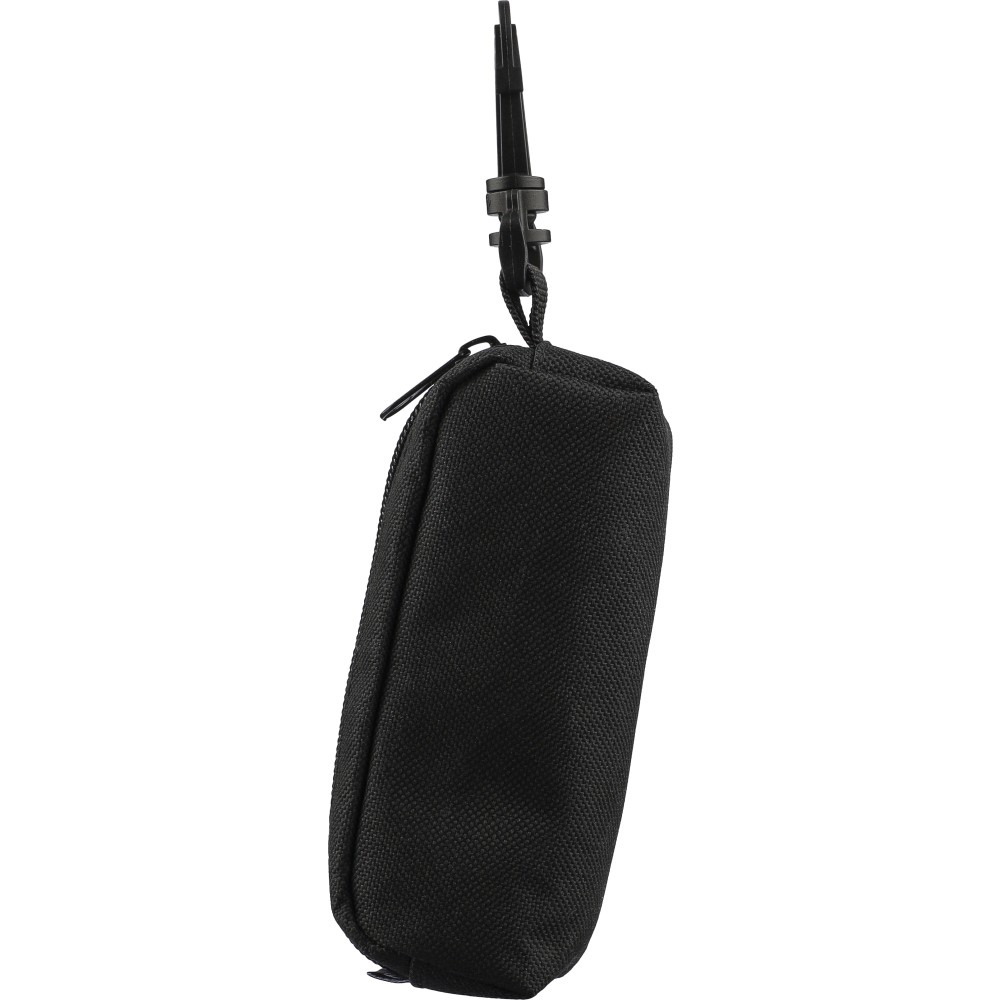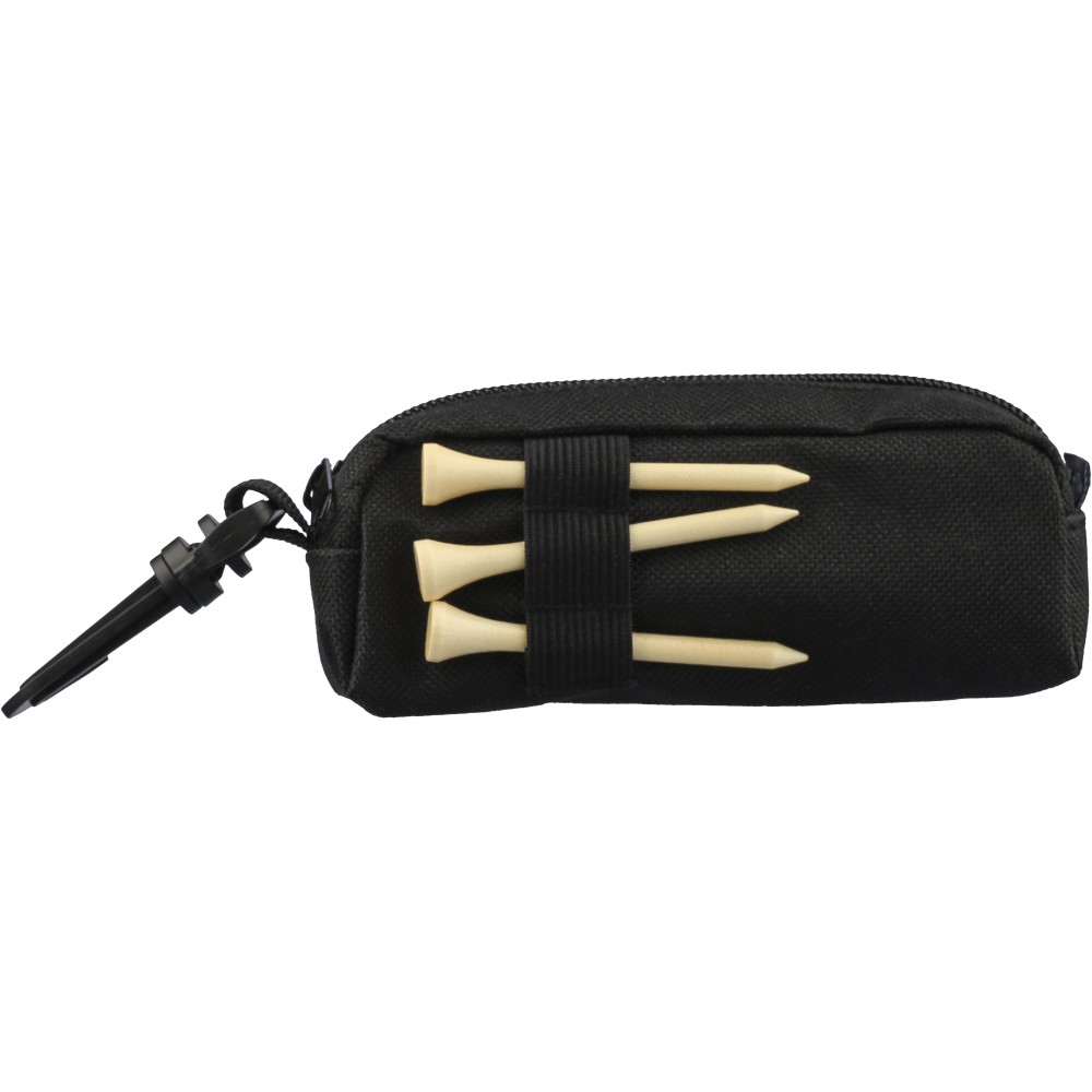 rPET golf set in a zippered pouch with PP carabiner, containing 3 practice golf balls and 3 beechwood golf tees. Ideal for promotional use and tee-off practice. Includes rPET label.