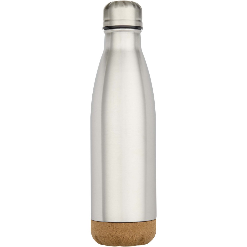 Vacuum insulated stainless steel water bottle with cork details at the bottom. The double-wall insulation keeps drinks hot for 12 hours and cold for 48 hours. Presented in a recycled cardboard gift box. Volume capacity: 500 ml.