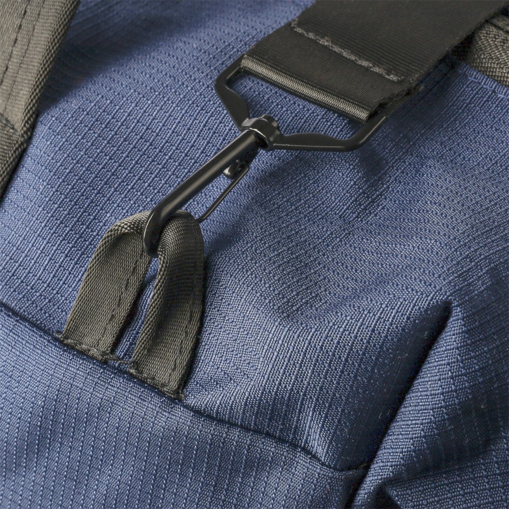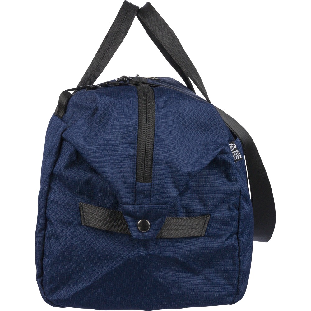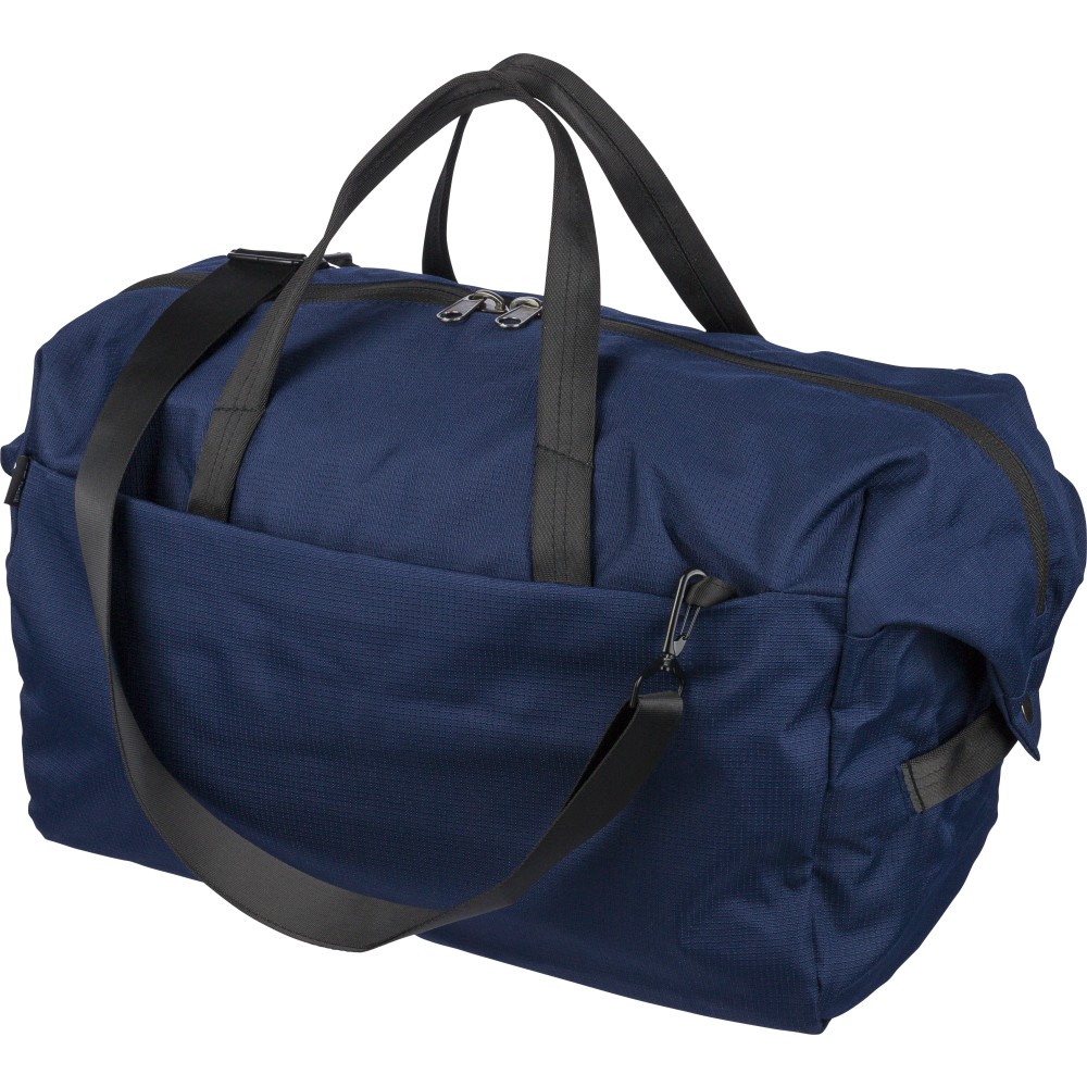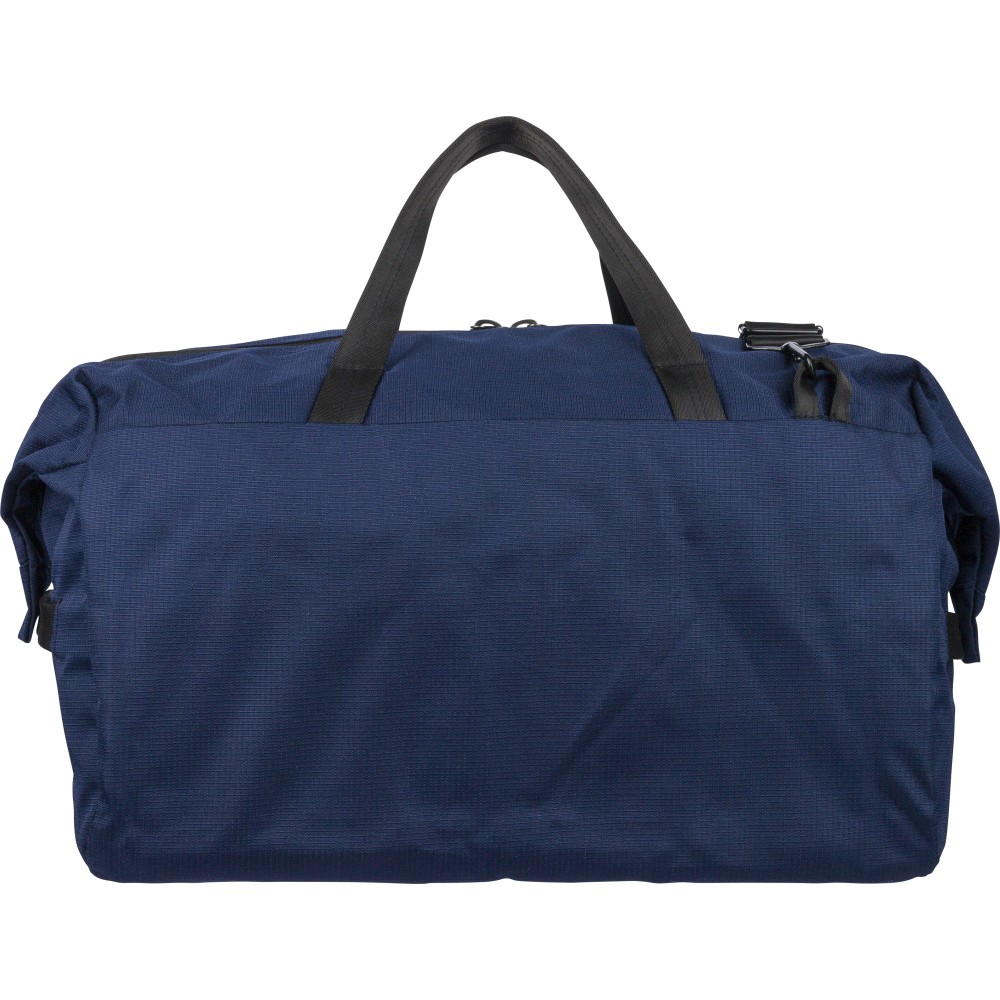 rPET 300D Ocean Bound sports bag made from recycled ocean plastic with a durable, textured finish. 33.7 l capacity with large main compartment, front and inner zippered pockets. Features two sturdy handles, adjustable shoulder strap, and Ocean Bound Plastic label.