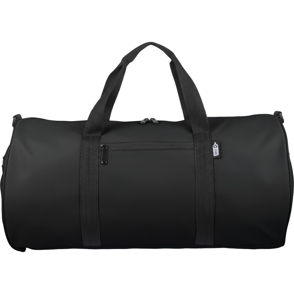 rPET duffle bag made from 600D polyester with 210D lining and water-repellent PU coating. Features a 40 l main compartment, front and side zippered pockets, mesh side pocket, two handles, and adjustable shoulder strap. Includes external rPET label.