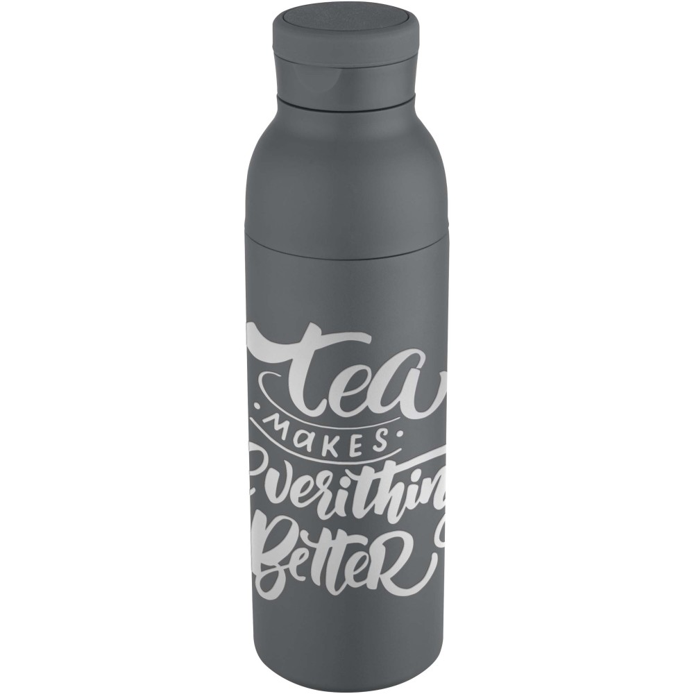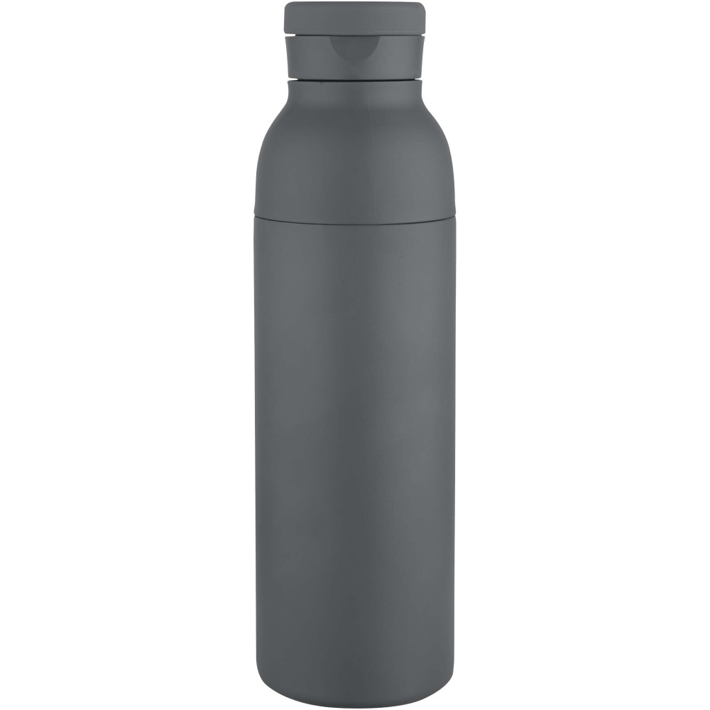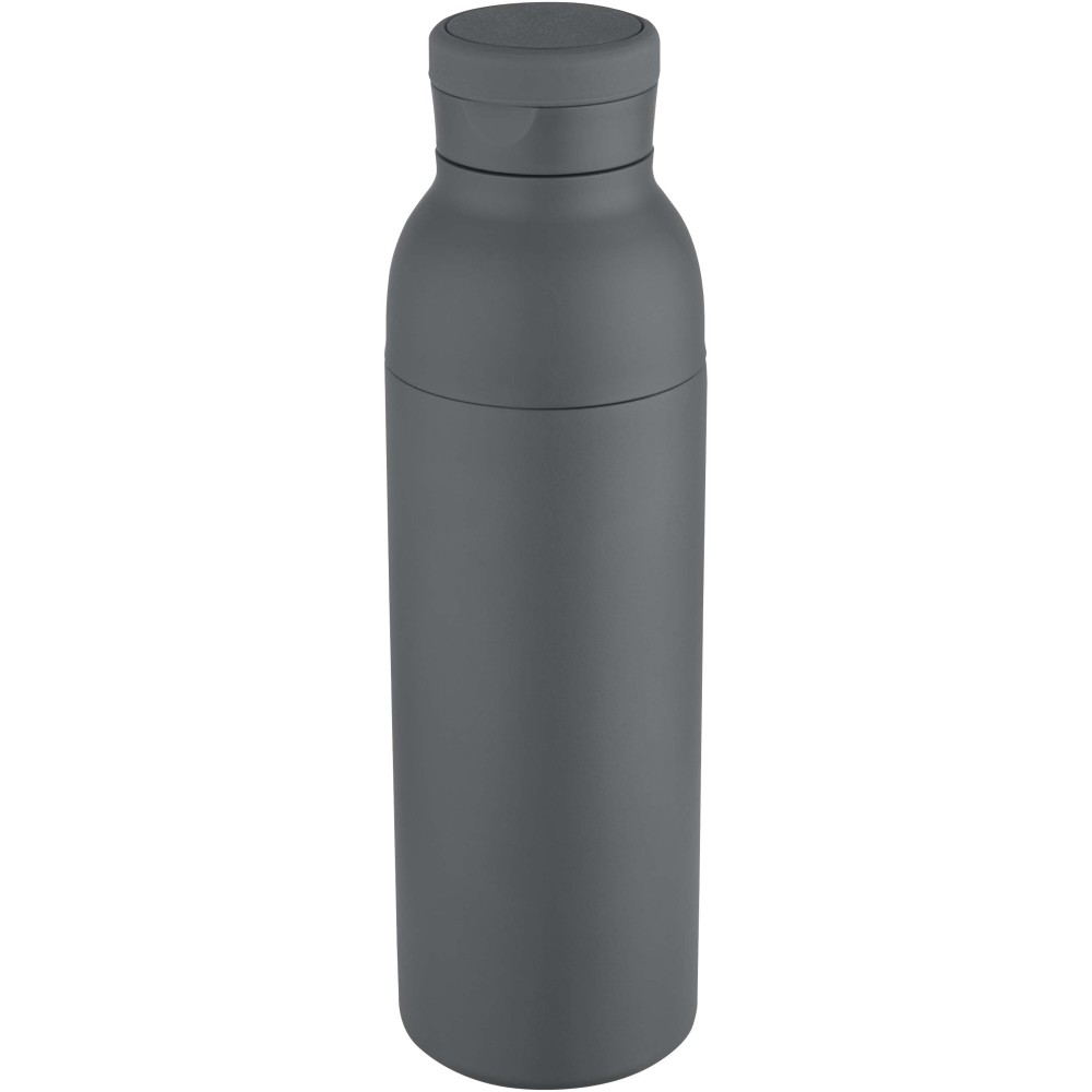 Double-walled, vacuum-insulated, RCS certified stainless steel water bottle featuring a discreet built-in silicone handle within the lid. Keeps drinks cold for 48 hours or hot for 12 hours. The two-piece construction makes cleaning easy, while the durable powder coating and copper plating ensure long-lasting performance. Presented in a recycled cardboard gift box. Volume capacity: 650 ml.