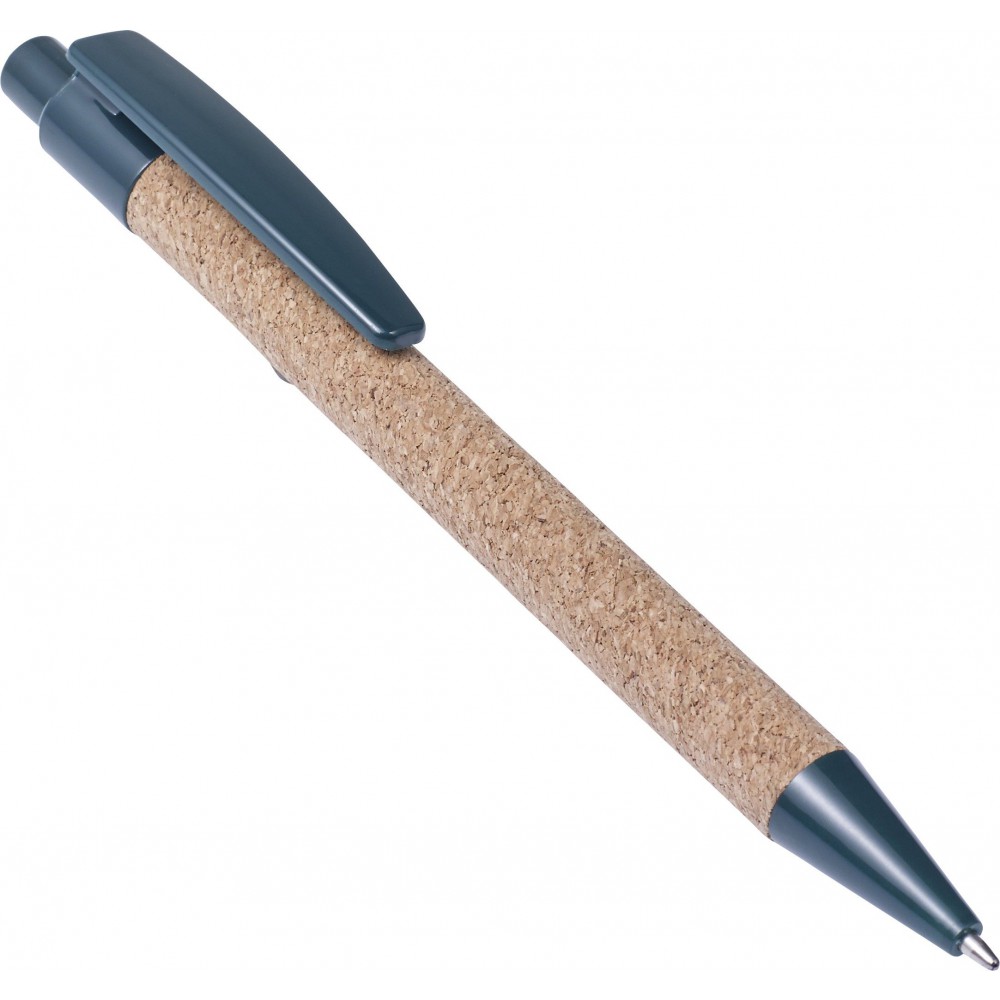 Cork ballpen with plastic tip, clip and top. Blue ink.